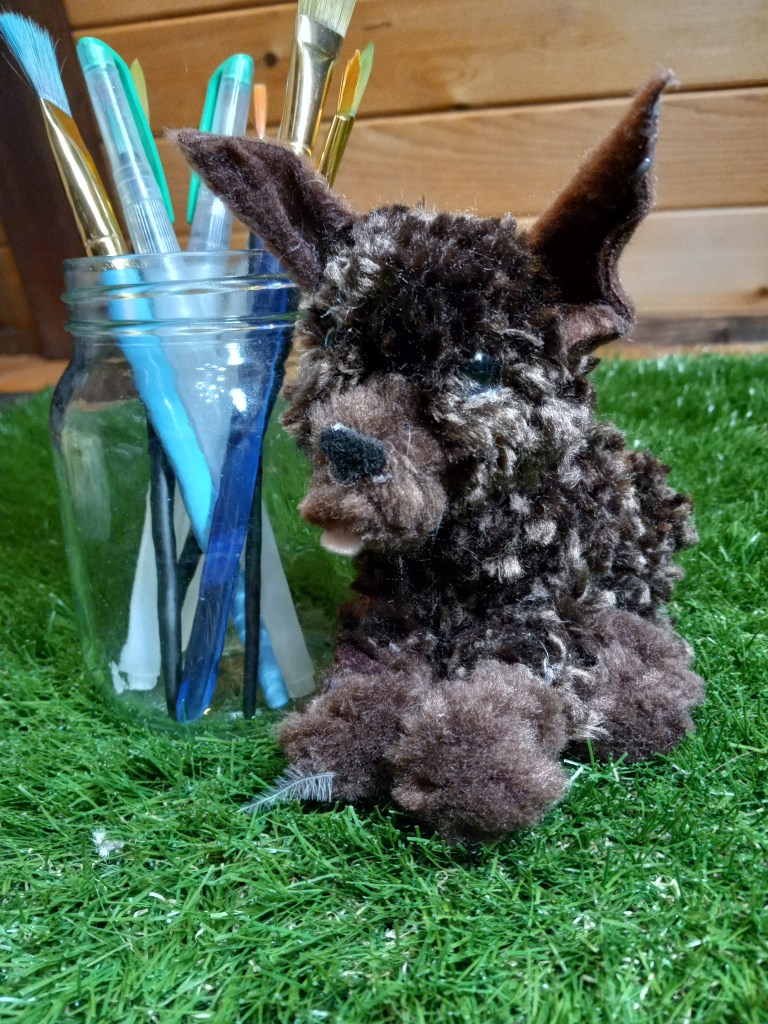 These little guys are created mostly from wool, yarn, hot glue, and beads. Pompom puppies originally got me into crafts and art from a Klutz pom-pom puppy-making kit. From there I’ve expanded the basic build to more realistic creatures. Later on, I took up felting, and from there it really exploded.