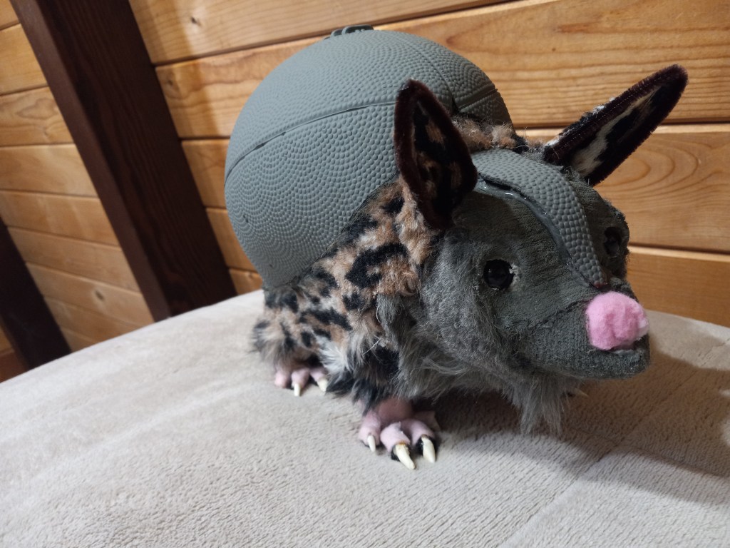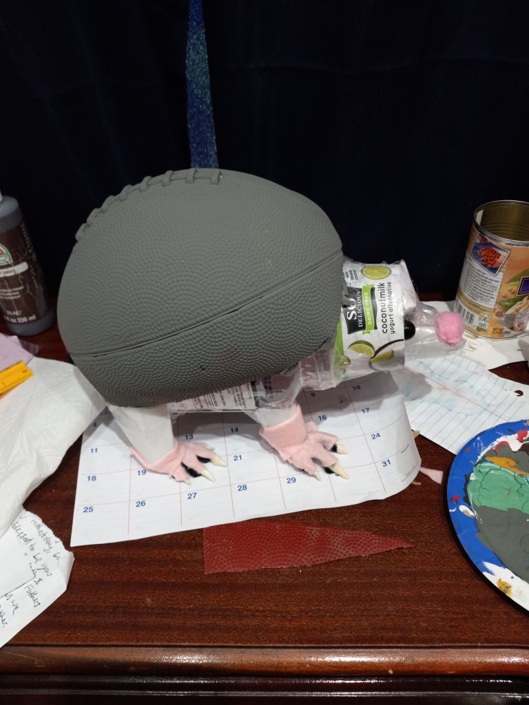 The structure of these critters usually contains water bottles, cans, plastic cups, cardboard, and cashew containers covered by faux fur and held together by tape and lots of hot glue!
